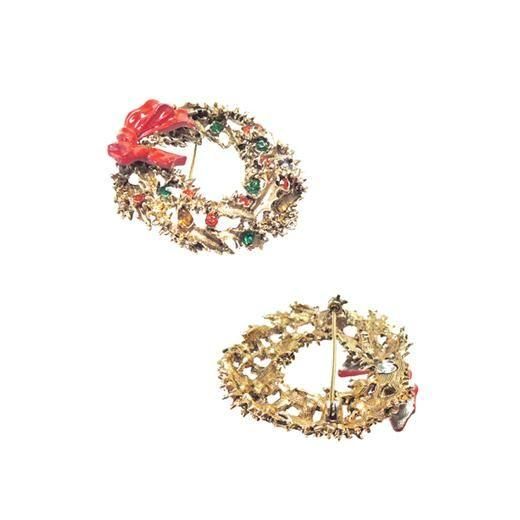 リースは小さなヒイラギとモミの木の葉、オレンジ、ブルー、イエローのラインストーンでデコレーションし、ところどころに雪を模したホワイトエナメルを薄くペイント、トップは真紅のリボンで装飾し可愛らしさを演出したブローチはアートらしい独特の存在感を放っています。ブローチの大きさは直径約48mm、重さ18,3g、コンディションは多少の経年感はありますがヴィンテージとしてのご使用には差し支えがない程度だと思います。裏側にARTの刻印が入っています。