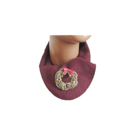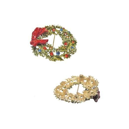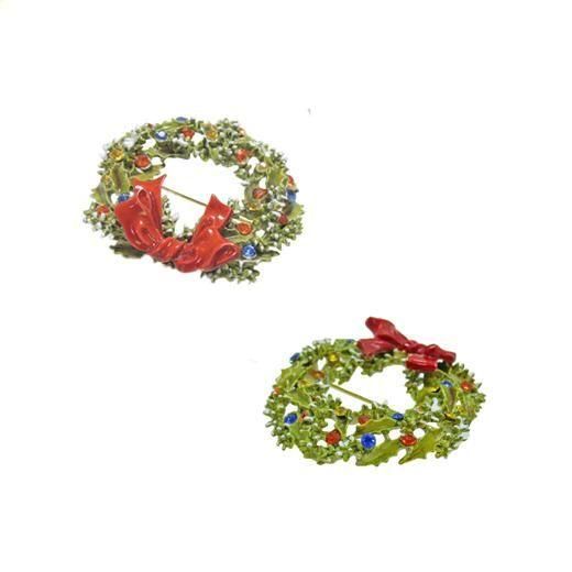 ところどころにあたかも雪が降ったような白いペイントをほどこした小さなリースはトップに赤いリボンを配し、小さなヒイラギとモミの木の葉、オレンジ、ブルー、イエローのラインストーンで飾られています。ペイントはすべて手彩色のため微妙な濃淡が色合いに深みを添え、ディテールの細部にいたるまで丁寧に作られている美しいひと品です。ブローチの大きさは直径約48mm、重さ21,2g、コンディションは多少の経年感はありますがヴィンテージとしてのご使用には差し支えがない程度、裏にARTの刻印が入っています。