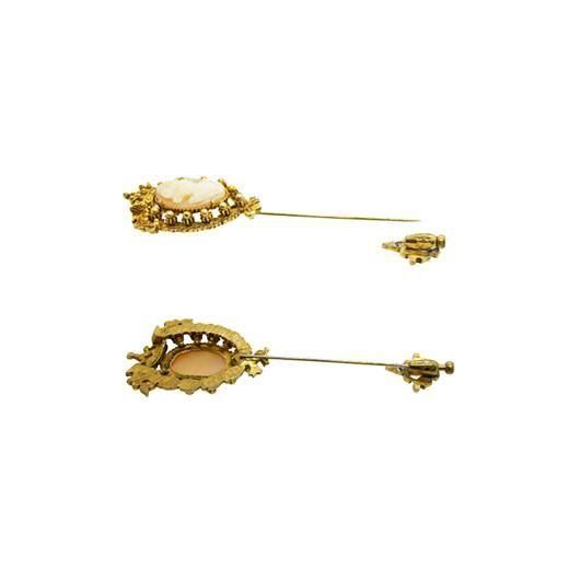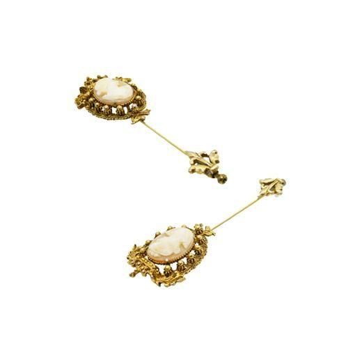 手彫りで貴婦人の横顔を描いたシェルカメオは周りをリーフモチーフとドットで装飾しトップに王冠をセッティング、ピンキャッチは王権の象徴でもあるユリの紋章フルール・ド・リスを用い、その繊細かつオールドワールド風の美しい装飾の存在感が抜群、クラフトマンシップ高さが感じられる魅惑的なアイテムです。カメオの大きさは20mm×25mm、全体の大きさは約37mm×112mm、、重さ21,2g、ピンの着脱はキャッチの下についているボッチを手で引いて抜き差しします。コンディションは多少の経年感はありますがヴィンテージとしてのご使用には差し支えがない程度だと思います。裏にFlorenzaの刻印が入っています。