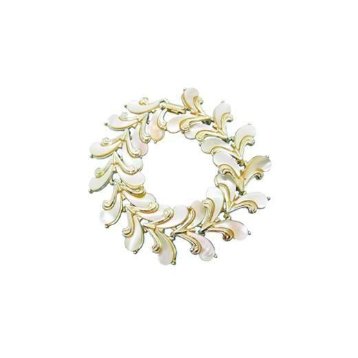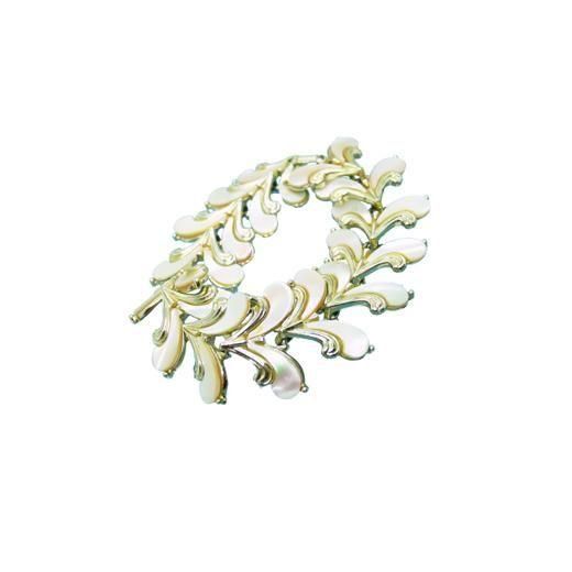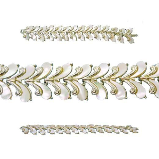 美しいアールヌーボースタイルの曲線を描く薄金色のパーツに神秘的な光沢を放つマザーオブパールを添えたエレガントなフォルムが魅力的、天然素材が生み出すリラクシングな雰囲気と美しい輝きは見るたびにうっとりしてしまいます。ブレスレットの長さは約20cm、幅約28mm、重さ51,4g、コンディションは接着剤がはみだしている箇所がありますが外観には大きく影響はないかと思います。その他多少の経年感はありますがヴィンテージとしてのご使用には差し支えはない程度、クラスプの裏側にMARHILLの刻印が入っています。マーヒルは市場にはあまり出てこないレアなブランドです。