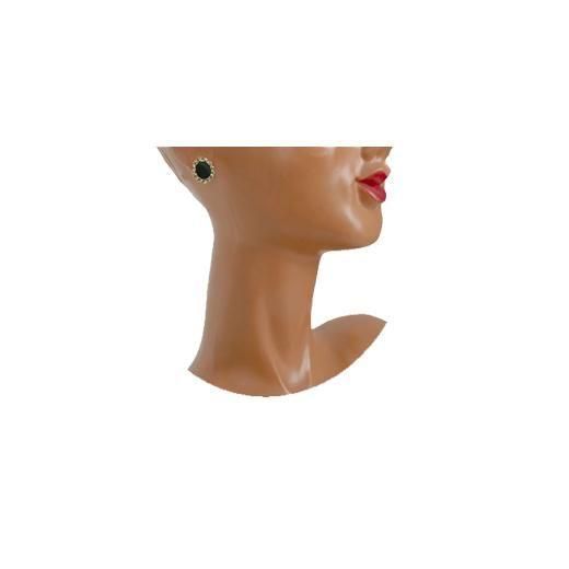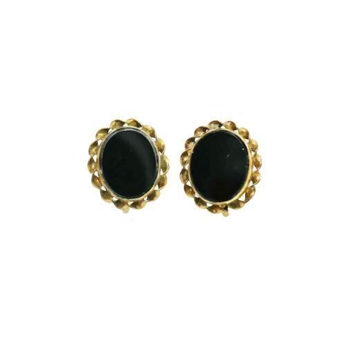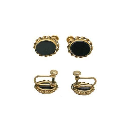 天然石オニキスのようなブラックの楕円形プレートをセンターに配置し周りをゴールドフィルド仕上げのバーをツイストさせた飾りで囲んだアイテムはシンプルエレガントなデザインが印象的、ブラック&ゴールドのシックなバイカラーが耳もとを上品に演出します。大きさは約13mm×16mm、重さ各2,0g、コンディションは多少の経年感はありますがヴィンテージとしてのご使用には差し支えがない程度です。金具に1/20 12KGF(商品全重量の1/20以上が12金)とGOLD FILLEDの刻印がありゴールドフィルドで仕上げられています。またブランドの刻印がありますが判読できません。
