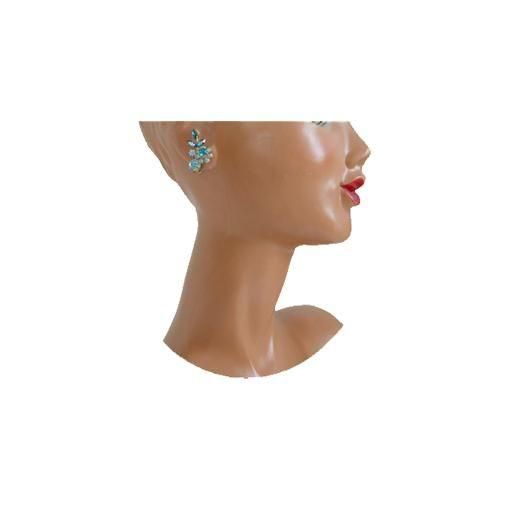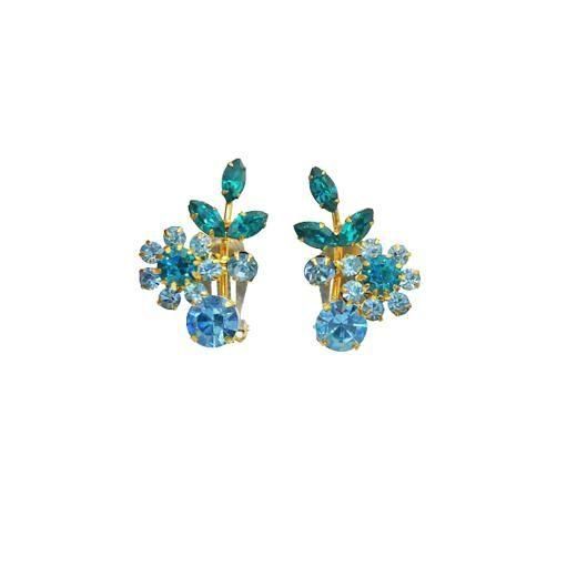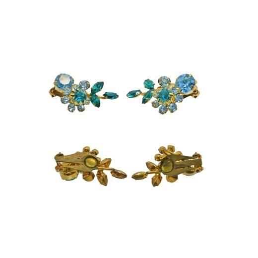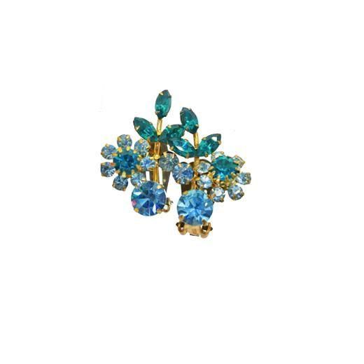 ゴールドカラーの台に色味の違うブルー系のラインストーンでお花やリーフ、蕾を表現した可愛らしいフォルムのアイテム、オーストリアらしいラインストーンの美しい色彩と輝きに心惹かれます。ラインストーンはすべて爪留め仕上げ、お花の大きさは直径約13mm、全体の大きさは約30mm×23mm、重さ各3,5g、コンディションは多少の経年感はありますがヴィンテージとしてのご使用には差し支えがない程度です。金具の底にAUSTRIAの刻印が入っています。