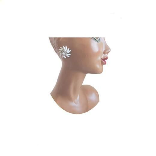 センターをミルク色のカボションとラインストーンで立体的に飾った洗練された雰囲気が魅力的なアイテム、周りを囲むジュディー・リーの作品に多用されている細長いラインストーンは繊細さとエレガントな品の良さを演出しています。また適度なボリューム感がリッチ&ゴージャスな印象を添えクラス感のある美しさを耳もとで醸し出します。イヤリングの大きさは直径約35mm、重さ各9,4g、ラインストーンはすべて爪止め仕上げ、コンディションは細長いラインストーンの先端に一か所1mmぐらいの欠けがありますが近くで確認してもわからない程度で外観には影響がありません。その他多少の経年感がありますが、ほぼ未使用と思われヴィンテージとしてのご使用には差し支えがない程度です。金具にJudy Leeの刻印、クリップの付根に金具に対してのデザイン特許の刻印PAT.PEND.が入っています。