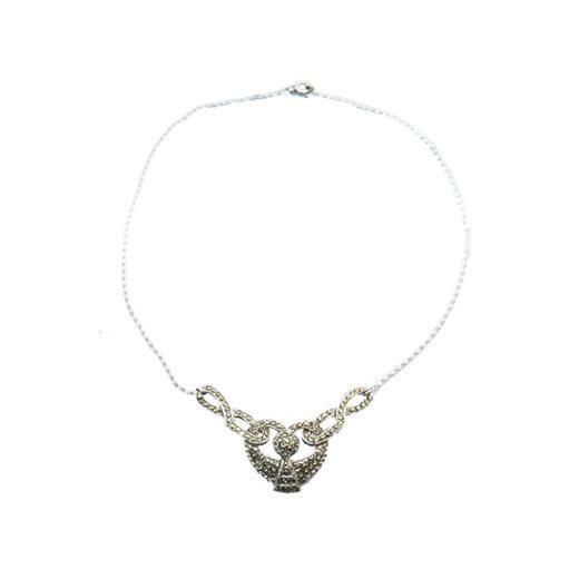 ケルトスタイルのテイストが漂っているシルエットの美しさが目を引くアイテムは小さめサイズのマーカサイトを使用しているため繊細な雰囲気を演出しデコルテラインをクラシカルにモードアップさせます。センター部分の大きさは約50mm×34mm、長さは約38cm、重さ7,2g、コンディションは多少の経年感はありますがヴィンテージとしてのご使用には差し支えがない程度です。