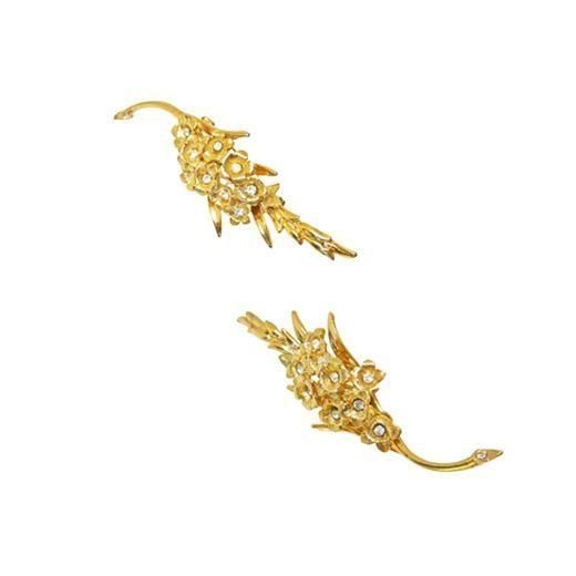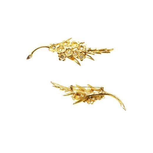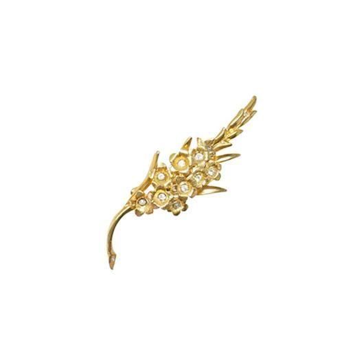 細部まで丁寧に作られた美しい小さな金色のお花が連なった可憐なアイテム、お花の中央にはラインストーンを配し煌きをプラス、刻印はありませんがディテールへのこだわりと細部まで丁寧に作られた美しいフォルムが魅力的です。フラワーモチーフは可愛くなりがちですが大人に似合う上品なひと品です。花の大きさは直径11mm、ブローチ全体の大きさは約94mm×33mm、重さ22,9g、コンディションは鍍金に多少の経年感はありますがそれをふまえればヴィンテージとしてのご使用には差し支えがない程度です。