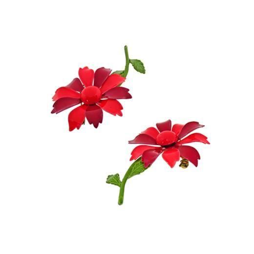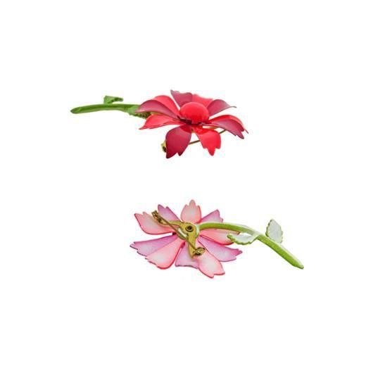 下のレイヤーにオレンジ、上のレイヤーに赤い花びらをセッティングし小さなリーフを2枚添えた可愛らしいお花はポップな色彩がキャッチー、コーディネイトにハッピーなテイストをプラスします。お花の大きさは直径46mm、全体の大きさは約73mm×46mm、重さ14,3g、コンディションは花びらに一か所小さなメッキロスがありますが近くで確認しないとわからない程度、その他多少の経年感はありますがヴィンテージとしてのご使用には差し支えがない程度です。