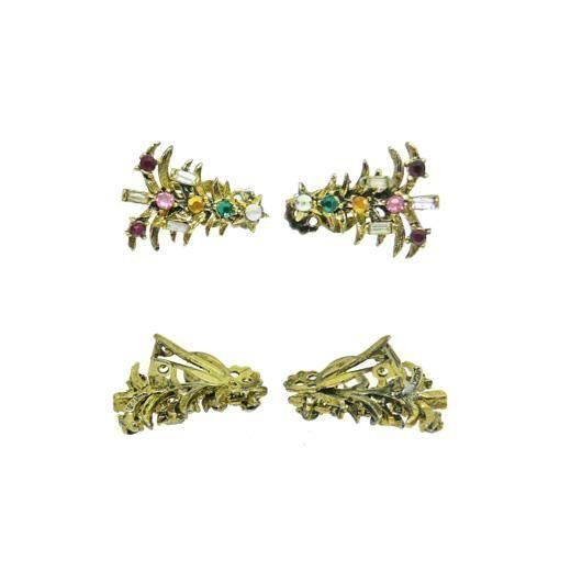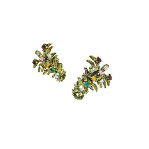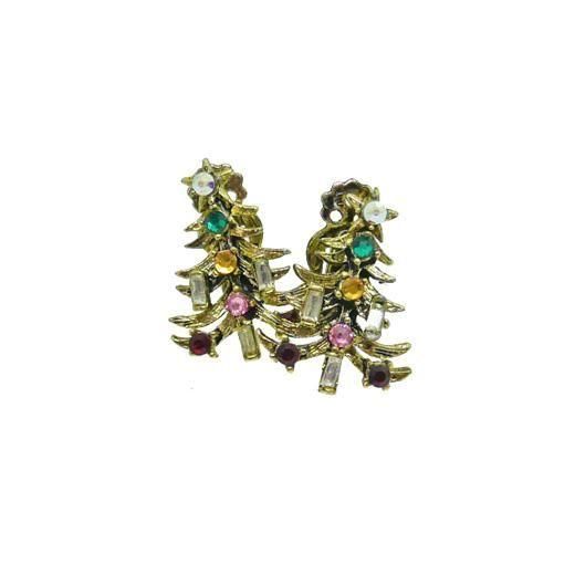 薄金色のクリスマスツリーに蝋燭に見立てたスクウェアー型のクリアラインストーン、レッド、グリーンなどのラウンド型ラインストーン、トップの小さなお星さまにオーロラカラーのラインストーンをセッティングしたイヤリングは小さいながらもホリークラフトらしいクラフトマンシップが感じられます。クリスマスシーズンの耳元のお洒落にお勧めします。大きさは30mm×22mm、重さ各4,8g、コンディションは片方のイヤリングクリップに修理の跡があるため値段に反映させています。なお修理されたクリップはしっかりと固定されています。その他多少の経年感はありますがヴィンテージとしてのご使用には差支えがない程度、裏側にHOLLYCRAFTの刻印が入っています。