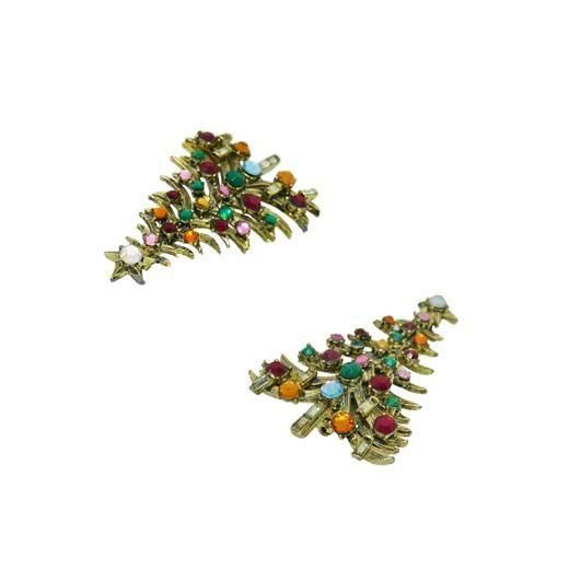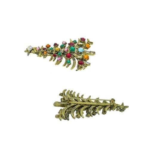 薄金色のツリーをレッド、グリーン、トパーズ、ピンク、ブルーの大小のラインストーンとスクウェアー型のクリアラインストーンで装飾した華やかでカラフルな色彩がクリスマスムードを盛り上げているアイテム、ライン模様が刻まれたツリーはプレートを二枚重ね奥行き感と陰影を演出、ホリークラフトらしいクラフトマンシップが感じられるひと品です。大きさは約40mm×63mm、重さ16,97g、コンディションは多少の経年感はありますがヴィンテージとしてのご使用には差し支えがない程度、裏にHOLLYCRAFTの刻印が入っています。