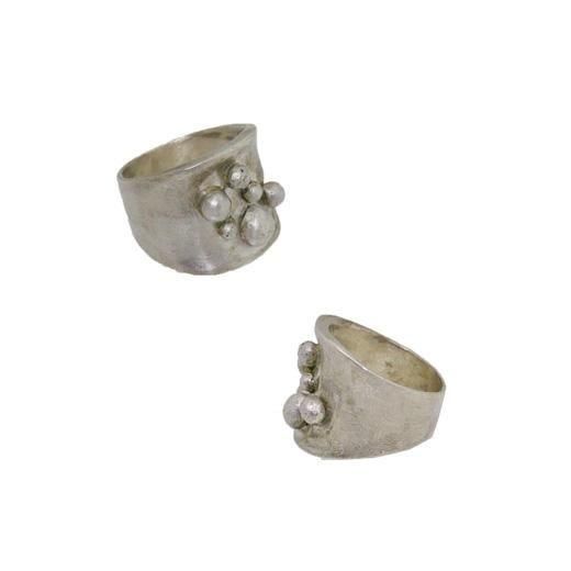大小のシルバーのドットをランダムにセッティングしたリングは全体をやすりでラフに磨きそのマットな質感はモードな雰囲気を漂わせ手元にアイキャッチーなポイントを演出、他にはない個性的で斬新なフォルムが魅力的なアイテムです。リングサイズは11号、センター部分の大きさは18mm×18mm、重さ10,1g、コンディションは多少の経年感はありますがヴィンテージとしてのご使用には差し支えがない程度です。裏に925の刻印が入っています。