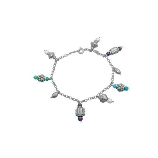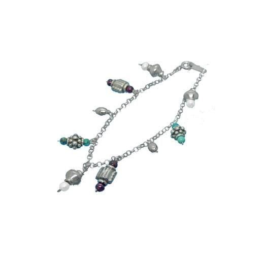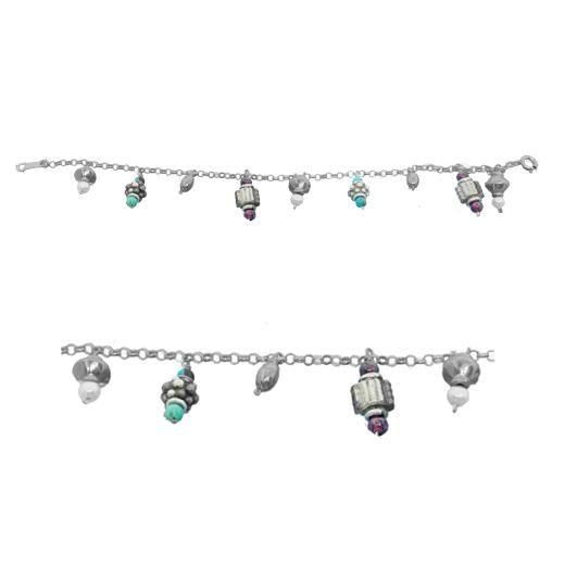 スターリングシルバーのシンプルなチェーンに様々な形の銀製のチャームをダングルさせ動きに合わせ手元で揺れる表情豊かなひと品、チャームはターコイズ、ガーネット、淡水パールで装飾され自然の素材が醸し出すリラクシングな雰囲気を放っています。タイムレスなデザインはどんなスタイルにもマッチし手元のお洒落を楽しめます。ブレスレットチェーンの長さは約18,0cm、幅46mm、重さ9,8g、コンディションは多少の経年感はありますがヴィンテージとしてのご使用には差し支えがない程度です。チェーンエンドにSILVER925の刻印が入っています。