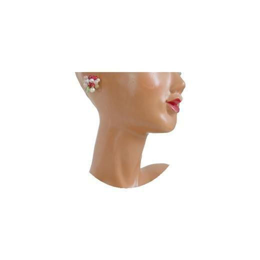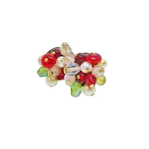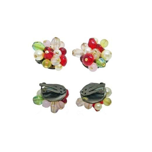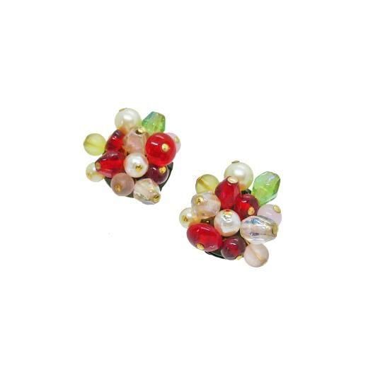 様々な形の赤系のビーズとパール、アクセントにペパーミントグリーンのガラスビーズを1石添えたアイテム、パーツは丁寧にひとつずつTピンでアンティークゴールド色の台にとめられているため左右の形が微妙に違い、その表情豊かなフォルムからはどこかスローな雰囲気が漂っています。大きさは直径約25mm、重さ各6,2gコンディションは多少の経年感はありますがヴィンテージとしてのご使用には差し支えがない程度です。