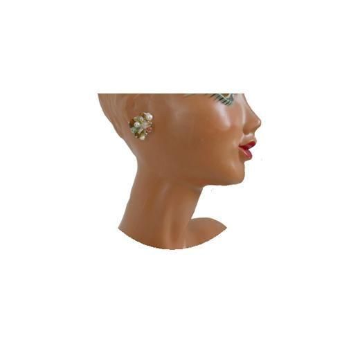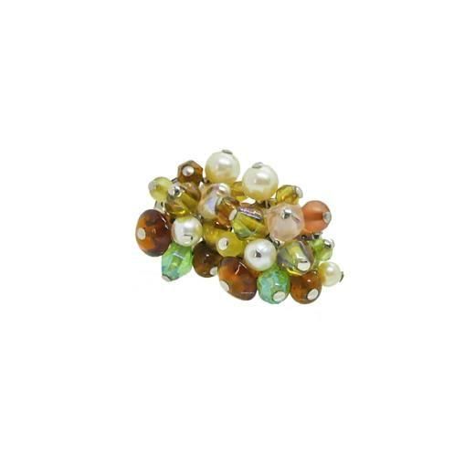 様々な形のトパーズ系のビーズとパール、アクセントにペパーミントグリーンのガラスビーズを1石添えたアイテム、パーツは丁寧にひとつずつTピンでシルバー色の台にとめられているため左右の形が微妙に違い、その表情豊かなフォルムからはどこかスローな雰囲気が漂っています。大きさは直径約25mm、重さ各6,6g、コンディションは多少の経年感はありますがヴィンテージとしてのご使用には差し支えがない程度です。