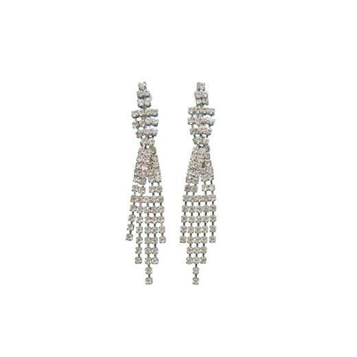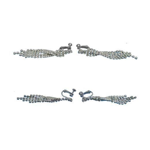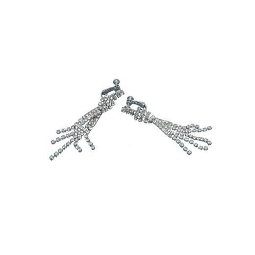 2連のラインストーンを途中でクロスさせエンドに連爪を5本ダングルさせたひと品は小さめサイズのラインストーンを使用しているため繊細な雰囲気を演出し、煌きの余韻を残しながら耳元でエレガントにスイングします。ラインストーンの大きさは2mm、イヤリングの大きさは約77mm×13mm、重さ各5,6g、コンディションは多少の経年感はありますがヴィンテージとしてのご使用には差し支えがない程度です。