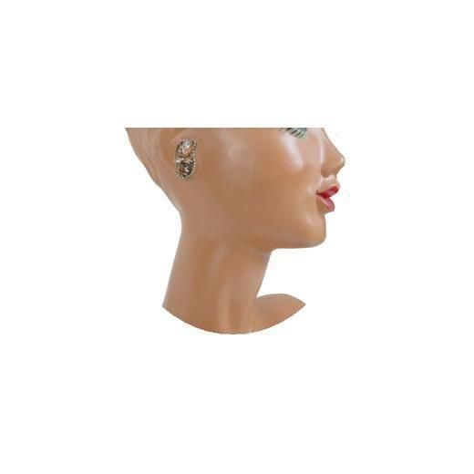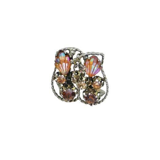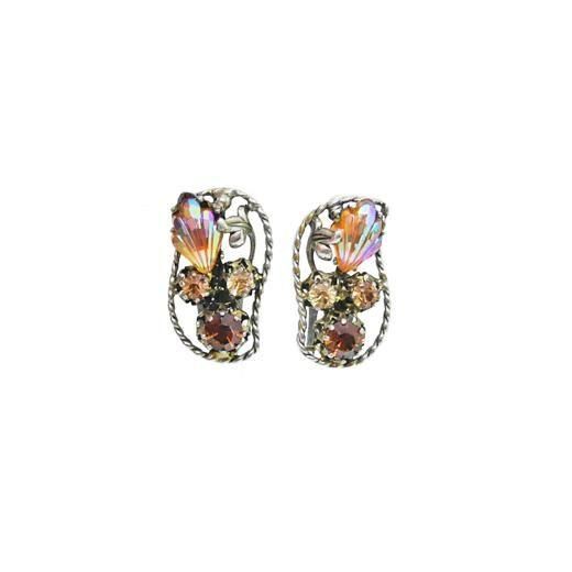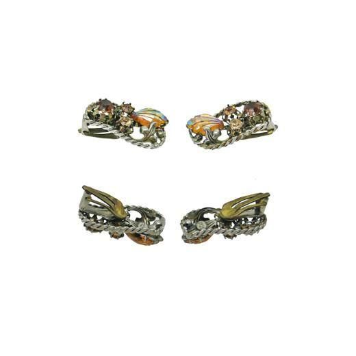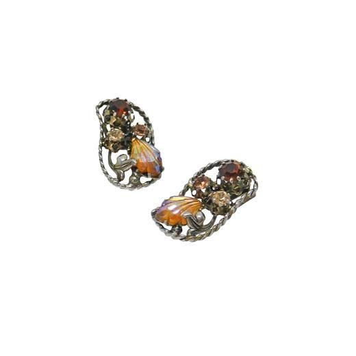 ツイスト模様をほどこしたアンティークゴールド色のフレームの中に濃淡のトパーズ色ラウンド型ラインストーン、リーフのような形のオーロラカラーのラインストーン、リーフモチーフのパーツをセッティングした肌なじみの良いシックな色彩と品の良いフォルムが魅力的なアイテム、ラインストーンの美しい煌きが耳元に華やかさを添えます。大きさは約28mm×16mm、重さ各4,2g、ラインストーンはすべて爪留め仕上げ、コンディションは多少の経年感がありますがヴィンテージとしてのご使用には差し支えがない程度です。金具にAUSTRIA、裏にSTARの刻印が入っています。