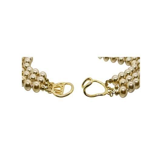 照りのある美しいシャンパンゴールドのパールは使いやすい8mm球、糸はパールを通し珠と珠の間に結び目をいれた高級感としなやかな動きを演出するオールノット仕上げ、クラスプもKJLのモノグラムが使われお洒落度がアップしいつものスタイルからパーティーシーンまでのコーディネイトをぐっと大人の表情に引き立てデコルテラインを上品に演出します。一番短い連の長さは約47cm、重さ約98g、コンディションは多少の経年感はありますがヴィンテージとしてのご使用には差し支えがない程度です。