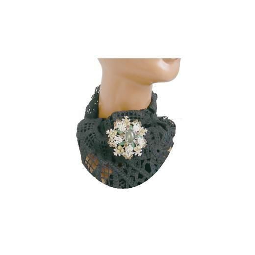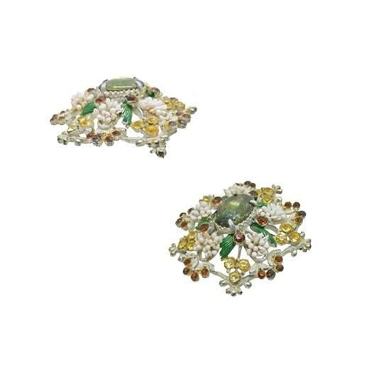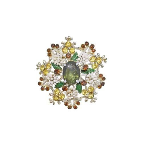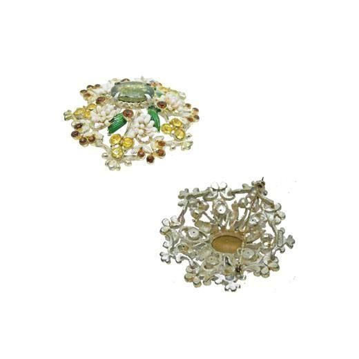 アートフラワーの材料のペップで装飾をほどこしたレアなアイテム、ドーム型のシルバーカラーの台にブラウン、ライトイエローのラインストーンや銀色の小さなリーフ、グリーンにペイントされたリーフをセッティングしセンターに楕円のラインストーンを配したアイテム、インパクトのあるデザインでありながらハードな印象になりすぎずフロレンザらしいアンティークライクで他社と一線を画す独創的なフォルムが魅力的です。大きさは直径約58mm、重さ29,9g、コンディションはセンターの楕円のラインストーン、鍍金などに経年感はありますがそれをふまえればヴィンテージとしてのご使用には差し支えない程度です。裏にFlorenzaの刻印が入っています。