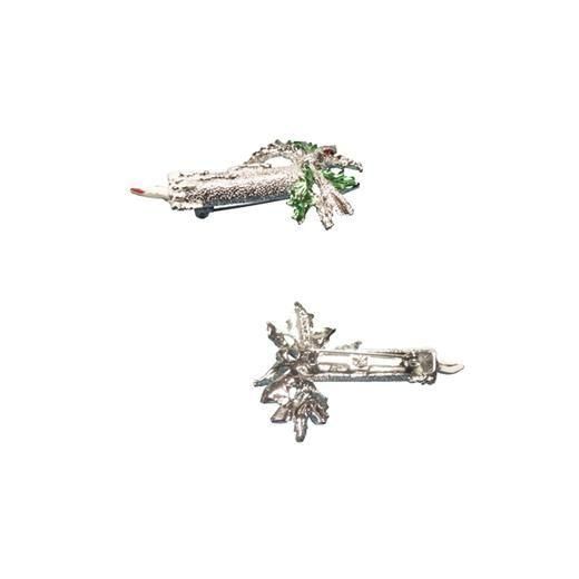 リボンで結んだ柊と赤い実で飾られた燭台に炎がゆらゆらと灯っているかのような蝋燭をのせたデザインは、家族団らんの暖かなクリスマスの食卓の雰囲気を連想させます。大きさは約35mm×54mm、重さ16,6g、コンディションは多少の経年感はありますがヴィンテージとしてのご使用には差し支えがない程度です。裏側にGERRY'Sの刻印が入っています。
