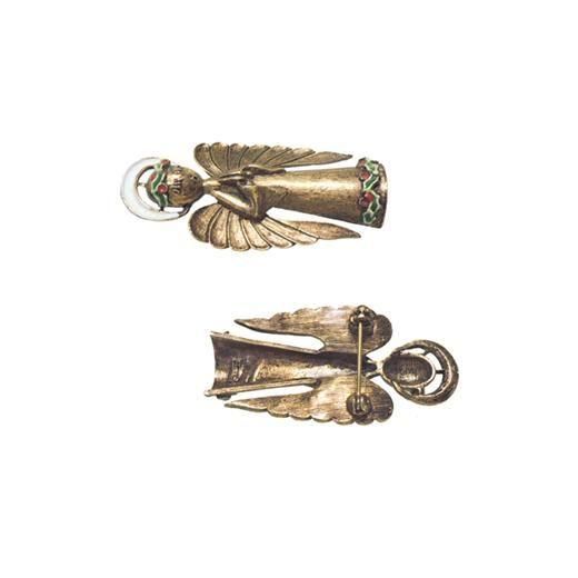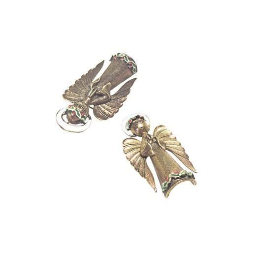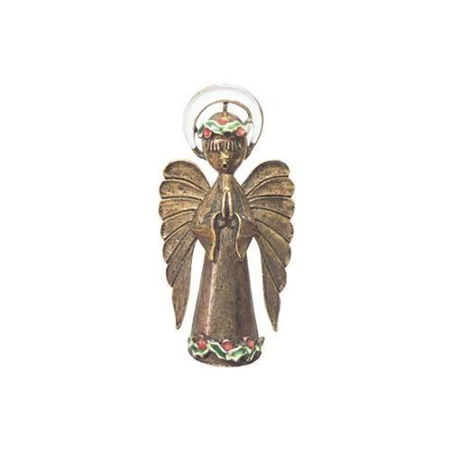 羽根を広げたアンティークゴールド色の天使は、手を合わせ歌っているかのようなキュートな仕草とクラッシクな雰囲気の中にユーモアをとりいれたフォルムがアイチャッチー、髪の毛と洋服の裾にヒイラギと赤い実が飾られクリスマスムードを盛り上げています。大きさは約27mm×55mm、重さ11,7g、コンディションは多少の経年感はありますがヴィンテージとしてのご使用には差し支えがない程度です。裏側にARTの刻印が入っています。