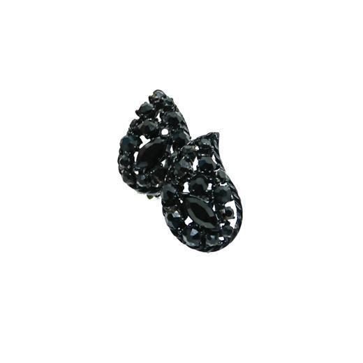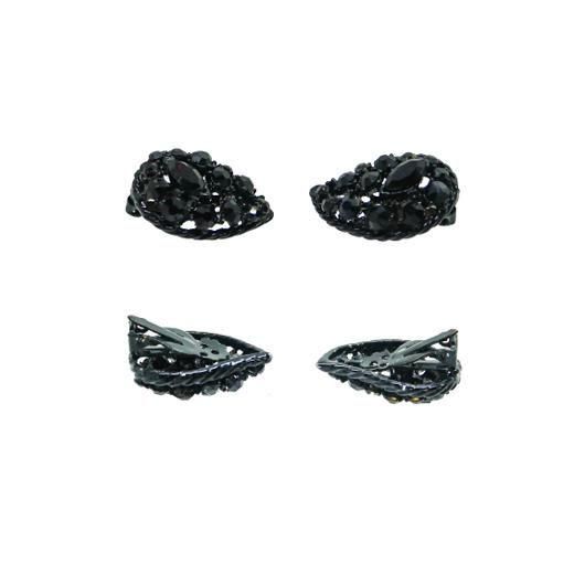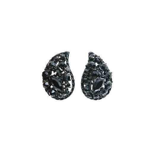 ジャパンドとよばれている黒鍍金をほどこしたロープ模様で装飾したペーズリー型のフレームの中にマーキスカットと大小のラウンド型ラインストーンをセンターにボリュームが出るようにセッティングしたひと品、お洒落なモノトーンが耳もとをアップデートし多彩なシーンでマルチに活躍します。大きさは約67mm×14mm、重さ各6,5g、コンディションは多少の経年感はありますがヴィンテージとしてのご使用には差し支えがない程度です。