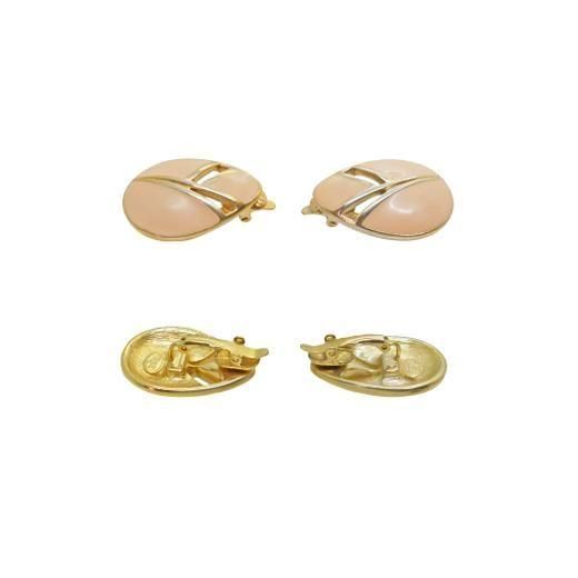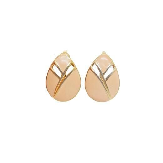 薄金色の縁取りがある卵型フォルムのイヤリングはY字型の透かし模様がアクセントになりシンプルなデザインのキャッチーなポイントになっています。ゴールドとサーモンピンクの上品な色彩のハーモニーも魅力のひとつ、耳元をフェミニンに演出します。大きさは約22mm×32mm、重さ各8,9g、コンディションは多少の経年感はありますがヴィンテージとしてのご使用には差し支えがない程度です。裏にTRIFARIの刻印が入っています。