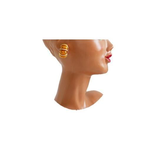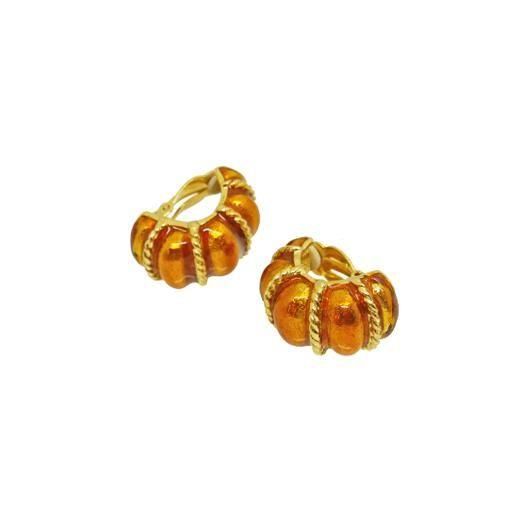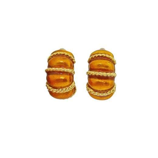 金色のロープ模様で区切られた透明感のあるトパーズ色で彩色されたイヤリングはパワフルなエイティーズの雰囲気が漂う華やかでボリューミーなデザインが印象的、耳元をファッショニスタ風にブラッシュアップさせてはいかがでしょうか。大きさは約18cm×32mm、高さ約18mm、重さは21,4g、コンディションは多少の経年感はありますがヴィンテージとしてのご利用には差し支えがない程度です。裏にJoan Riversの刻印が入っています。
