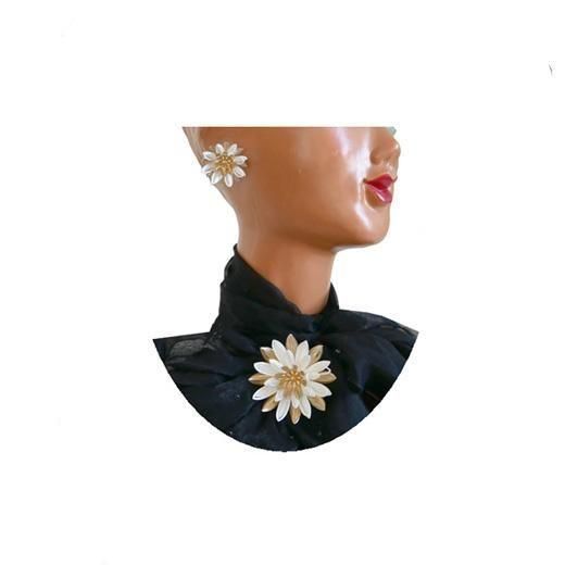 睡蓮はフランスの印象派の巨匠クロード・モネが連作を重ねたように、その幻想的な美しさが魅力的、サラ・コベントリーの睡蓮はホワイトとゴールドのコンビネーションでモダンなテイストをプラスしレイヤーを重ねた花びらが立体感を演出、植物モチーフをスタイリングのアクセントにあしらい装いに女性らしさとエレガントな可愛さ演出します。ブローチの大きさは直径62mm、重さ22,8g、イヤリングの大きさは直径約32mm、重さ6,6g、コンディションは多少の経年感はありますがヴィンテージとしてのご使用には差し支えがない程度だと思います。ブローチ、イヤリングともにSARAH COVの刻印が入っています。