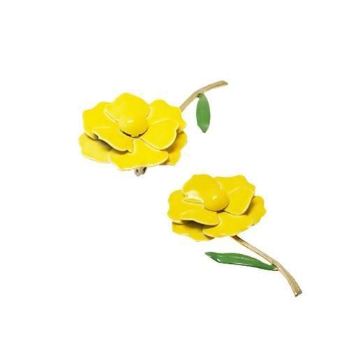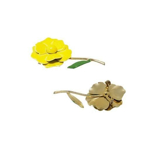 キッチュな可愛らしさを放つ黄色いお花はヴィンテージらしいスローでほっこりとしたアトモスフェアーが漂ってます。サイズもヴィンテージのフラワーアイテムとしては少し小さめのためコーディネイトにもすんなりとマッチしスタイリングにラブリーで大人可愛いアクセントを添えます。お花の大きさは直径約38mm、全体の大きさは約69mm×38mm、重さ8,7g、コンディションは多少の経年感はありますがヴィンテージとしてのご使用には差し支えがない程度です。