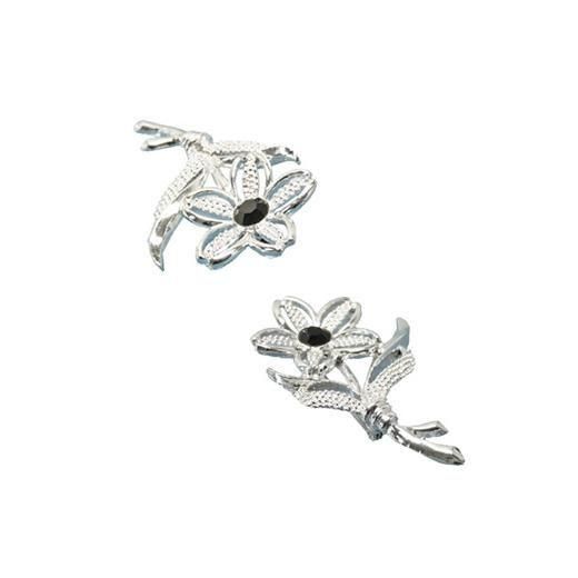 清楚なシルバーカラーの小さなお花の中心にはブラックラインストーンがセッティングされ、モノトーンの色彩がシックで大人可愛い雰囲気を演出、コーディネイトにも合わせやすくスタイリングにさり気なくフェミニンなアクセントを添えます。お花の直径は22mm、ブローチ全体の大きさは約34mm×56mm、重さ10,6g、コンディションは多少の経年感はありますがヴィンテージとしてのご使用には差し支えがない程度だと思います。裏にSARAH COVの刻印が入っています。