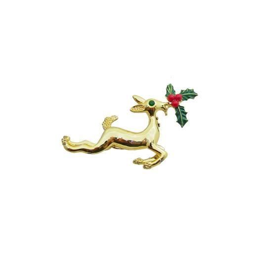 軽やかに駆け回っているかようなトナカイは赤い実をつけたヒイラギの葉をくわえクリスマス気分を盛り上げています。ホリデーシーズンのコーディネイトのラブリーなアクセントにお勧めできるアイテムは、グリーンラインストーンの愛らしい瞳がチャームポイントです。大きさは約57mm×39mm、重さ16,4g、コンディションは多少の経年感はありますがヴィンテージとしてのご使用には差し支えがない程度です。裏にGERRY'Sの刻印が入っています。