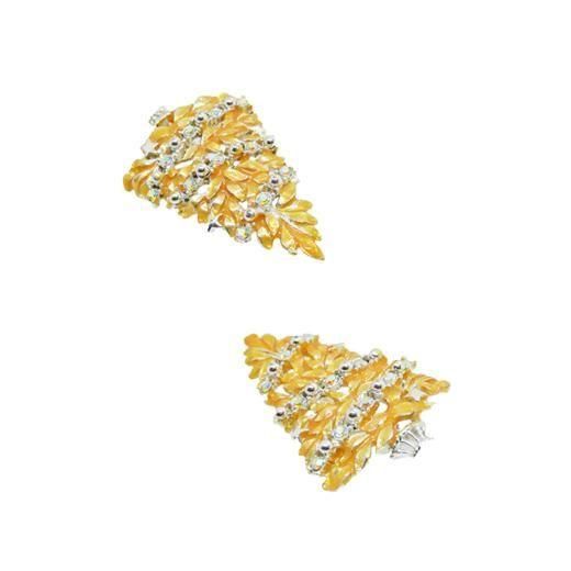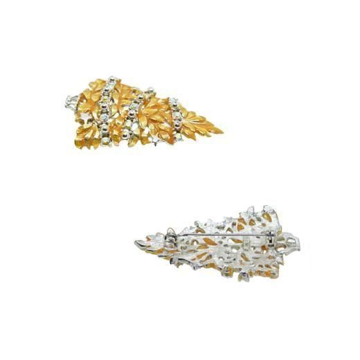 銀色のツリーの葉の部分はキラキラと輝くグリッターを混ぜた生成り色をペイントし斜めにセッティングしたオーナメントのリボンは銀色のドットとオーロラカラーのラインストーンを交互に配し華やかできらびやかなホリデー気分を盛りあげます。大きさは約41mm×57mm、重さ21,3g、コンディションは多少の経年感はありますがヴィンテージとしてのご使用には差し支えがない程度です。裏にCORELの刻印が入っています。