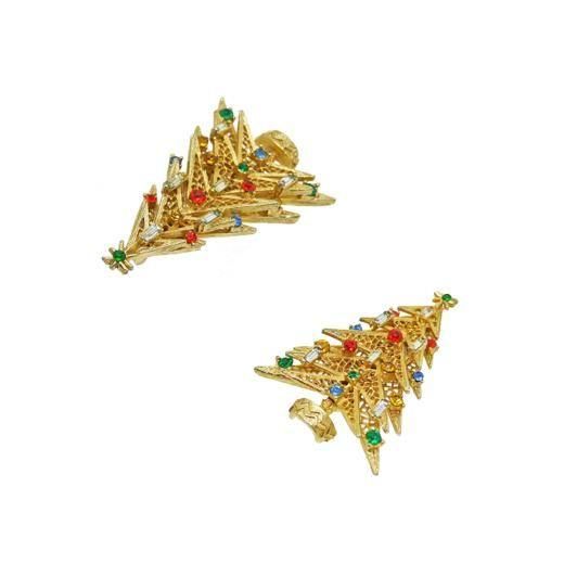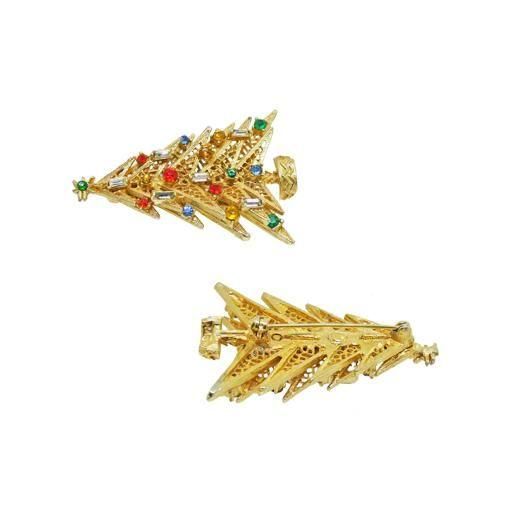ツリーはリーフではなく、直線と網目模様で表現したアーティスティックなデザインがキャッチー、また二本のツリーを上下で重ねているため奥行き感と陰影を演出しています。長方形のクリアラインストーンを蝋燭に見立てカラフルなラインストーンをオーナメントとしてデコレーションしたアート社らしいクラシカルなテイストも魅力のひとつです。ブローチの大きさは37mm×54mm、重さ16,6g、コンディションは多少の経年感はありますがヴィンテージとしてのご使用には差し支えがない程度です。裏にARTの刻印が入っています。