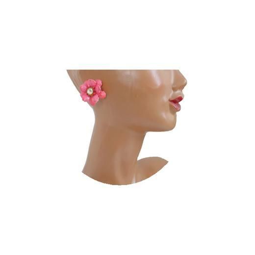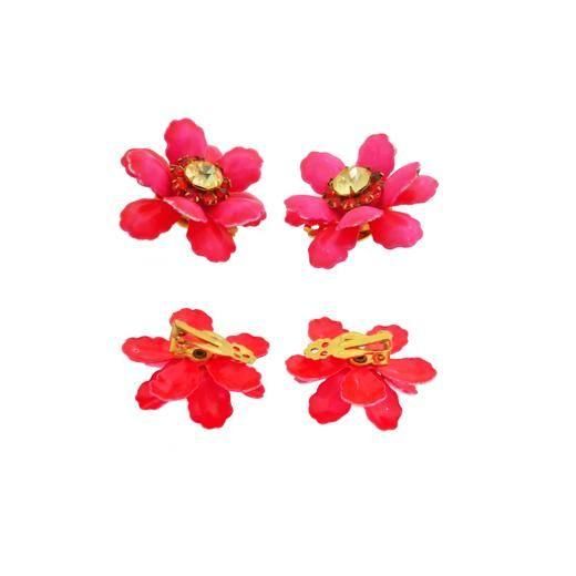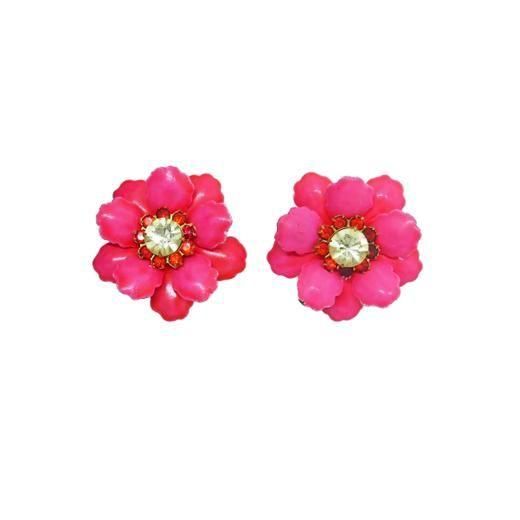 乙女心をくすぐる鮮やかなピンクがとってもキュートでフォトジェニックなアイテム、センターのクリアライストーンをオレンジ色の小さなラインストーンで囲み五枚の花びらをレイヤーに重ね立体感を際立たせたデザインは耳元でガーリーなインパクトを放ちます。中央のラインストーンの大きさは8mm、イヤリング全体の大きさは直径約35mm、重さ各6,8g、コンディションは多少のペイントロス及びラインストーン数個に経年感はありますが外観には大きな影響はなくヴィンテージとしてのご使用には差し支えがない程度です。