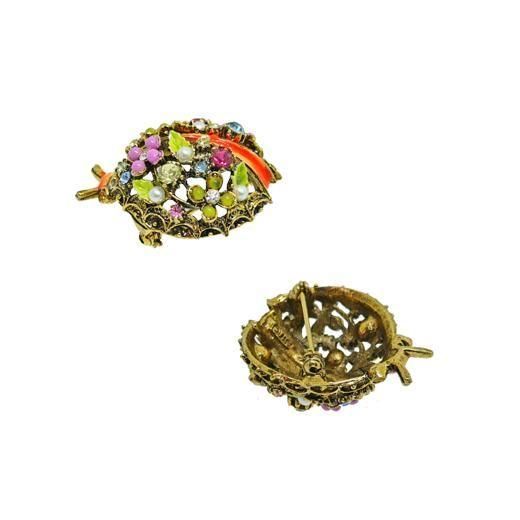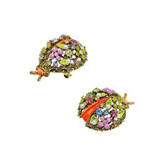 テントウ虫の頭と胴体はオレンジ色のエナメルで彩色され、アンティークゴールド色の羽根はお花、リーフ、パール、ラインストーンをセッティング、羽根のエッジは細かい模様で装飾されアートらしい他社と一線を画す独創的かつクラフトマンシップが感じられるフォルムが魅力的です。フェミニンでラブリーな色彩が魅力的なデザインは、どんなコーディネートにも個性的かつ華やかなアクセントを添えます。大きさは約31mm×40mm、重さ12,3g、コンディションは多少の経年感はありますがヴィンテージとしてのご使用には差し支えがない程度です。裏にARTの刻印が入っています。